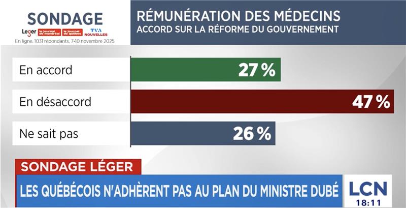 Un sondage mené par le Journal de Montréal/Journal de Québec et TVA dévoilé mardi et mené par Léger révèle que 73 % des Québécois craignent un exode des médecins, et que 47 % des Québécois sont en désaccord avec la réforme de la rémunération de médecins de la CAQ, et que seuls 26 % l’appuient.