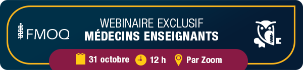 La FMOQ vous convie à un webinaire exclusif aux médecins enseignants le 31 octobre prochain à 12 h. Les enjeux de la pratique en GMF-U y seront notamment abordés, ainsi que les défis politiques actuels, la valorisation du rôle des médecins enseignants et les outils de communication et de représentation de la FMOQ. Soumettez à l’avance vos questions et sujets d’intérêts sur le site d’inscription. Inscrivez-vous dès maintenant !