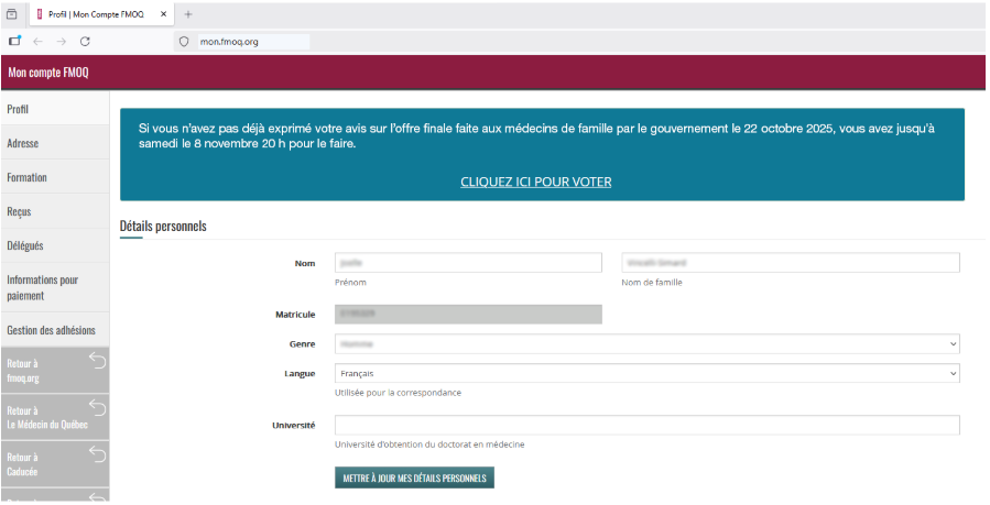 Attention : en date d’aujourd’hui, à 8 h, et en vertu des statuts et règlements de la FMOQ, le vote sera ouvert seulement aux 8619 membres éligibles. Il n’est plus possible de rectifier son admissibilité pour cette procédure de vote.